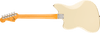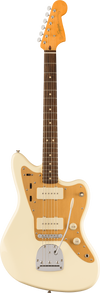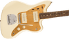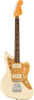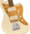 The J Mascis Jazzmaster® features a basswood body, C-shaped maple neck, rosewood fingerboard with 9.5" radius and 21 jumbo frets, two single-coil Jazzmaster pickups with three-position switching and dual tone circuits, gold anodized aluminum pickguard, aged white plastic parts (knobs, switch tip, pickup covers), Adjusto-Matic™ bridge with vintage-style floating tremolo tailpiece, vintage-style tuners, chrome hardware, Vintage White finish and J Mascis signature on the back of the large '60s-style headstock.